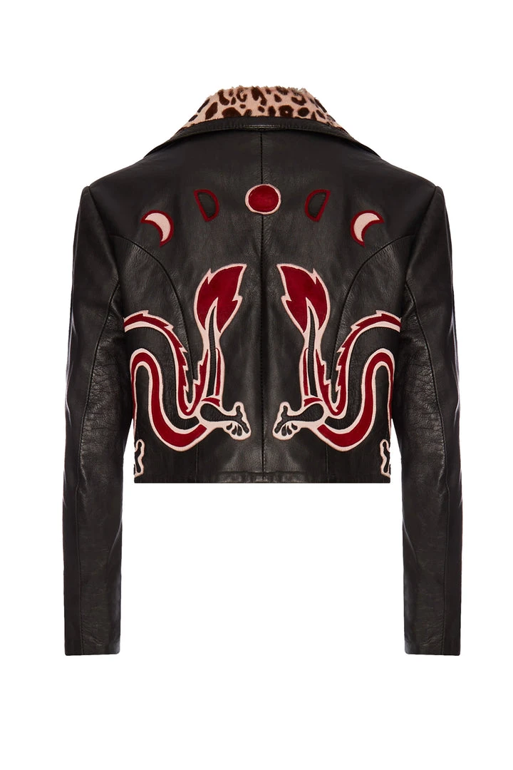 Custom made cropped black leather with appliqué dragon and crescents; leopard print lapels;