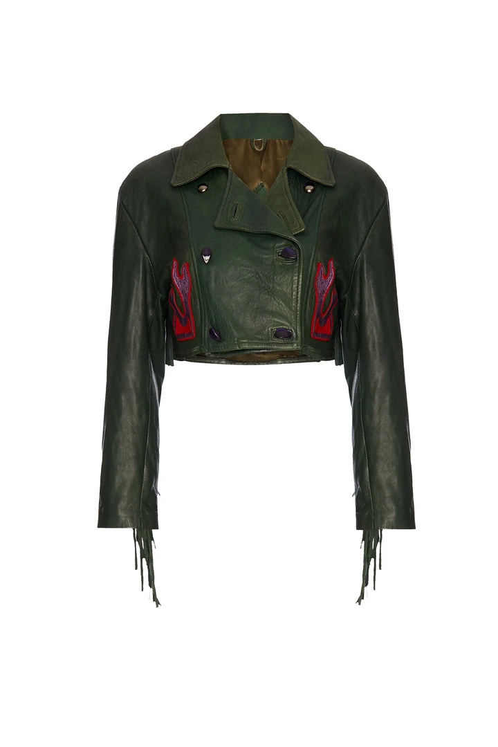 Custom hand made jacket with appliqué patches of Egyptian cats; religious symbolism and fringed sleeves; up cycled and sustainable fashion; one-of-a-kind pieceÂ