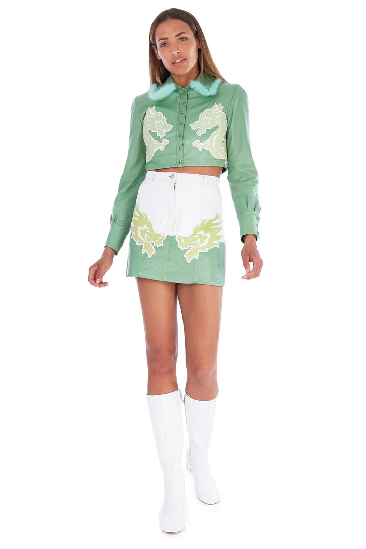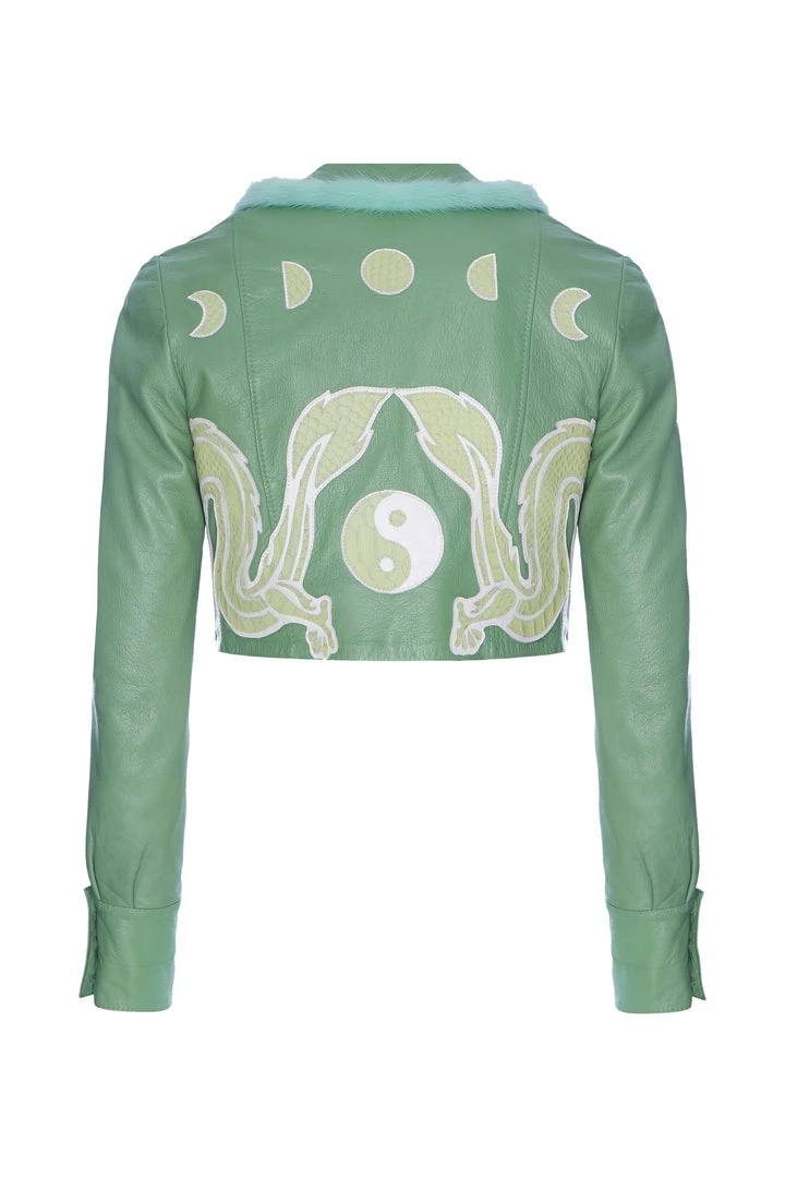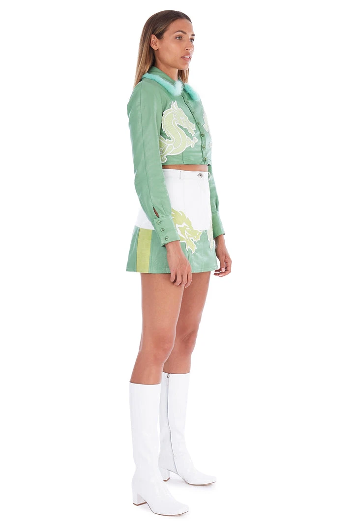 This leather green jacket has been beautifully enhanced with vintage white leather lined detailing at the bottom and sleeves, hand stitched and is truly one of a kind.