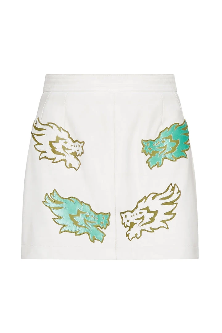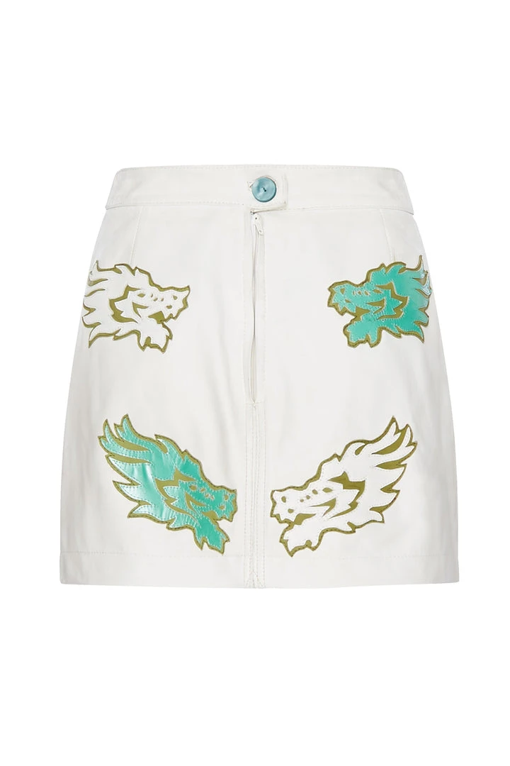This leather green skirt has been beautifully enhanced with vintage white leather lined detailing, hand stitched and is truly one of a kind.