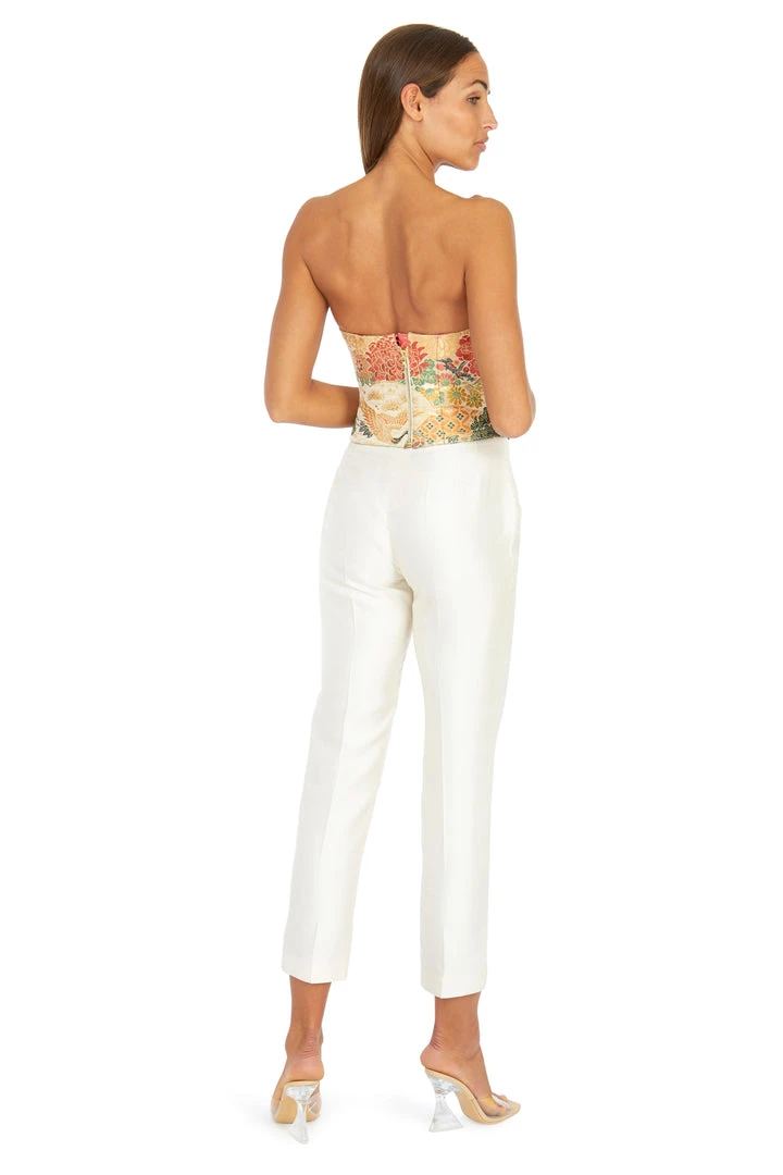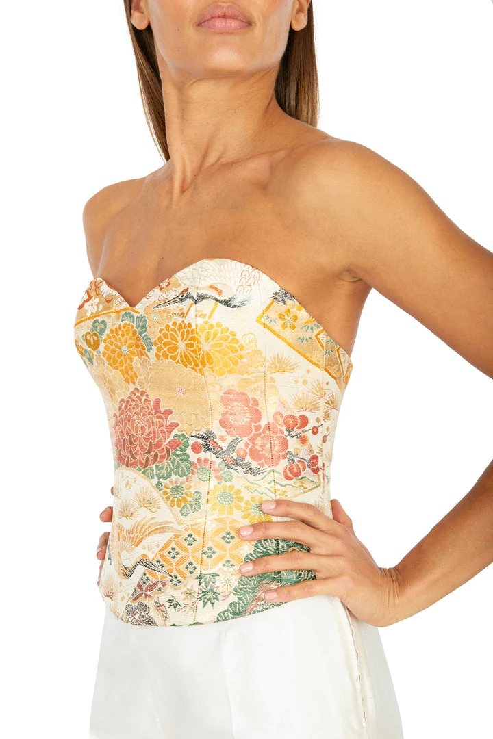 This Corset is a unique piece made from a Japanese Obi coming from Hokkaido from the Showa Era. An Obi is a sash or a belt used to hold in place a kimono, a Japanese traditional dress. This particular one is a Vintage Maru Obi, the silk is carefully woven on both sides and folded in half. The fold line of the former Obi is still visible on the corset.