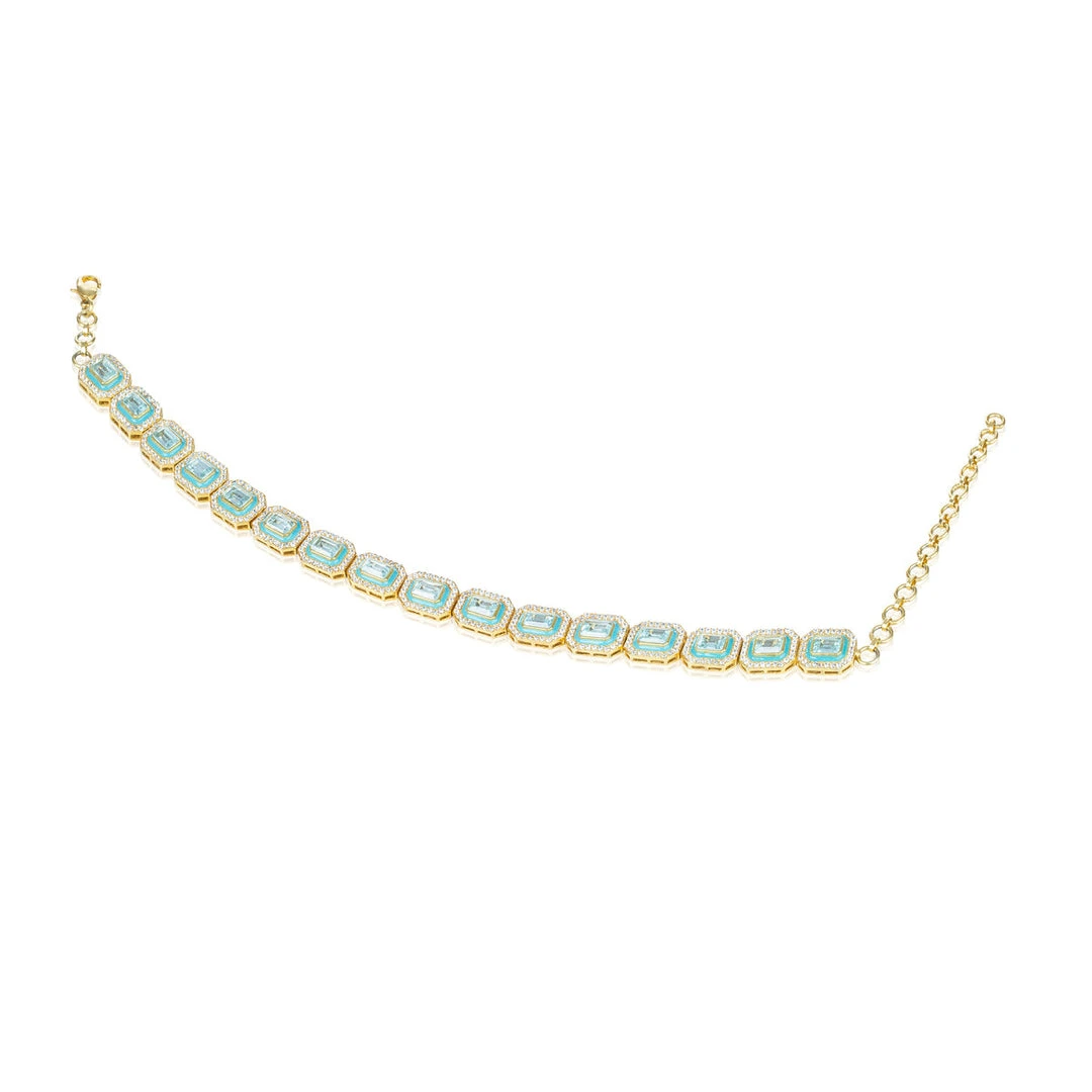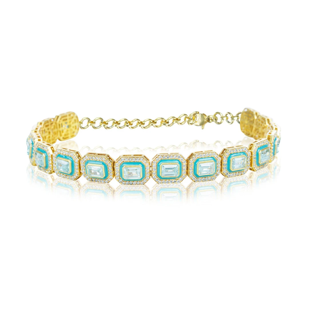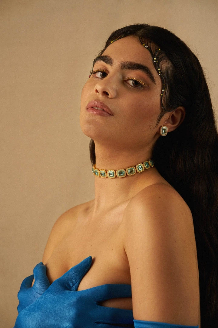 Show-stopping Aquamarine blue gemstone choker with hand painted enamel detail, embellished with Cubic Zirconia to perfection. Bedazzle and make a statement! Complete the look with the matching Malika Studs or the Malika Earrings.