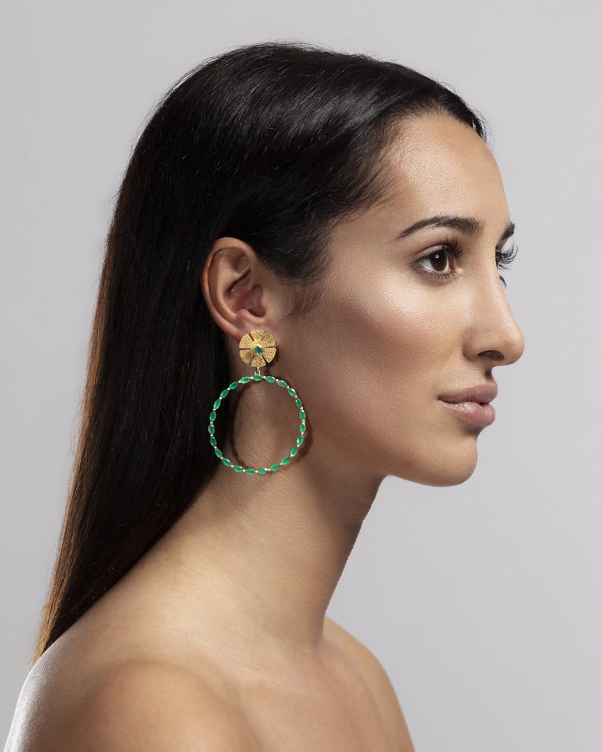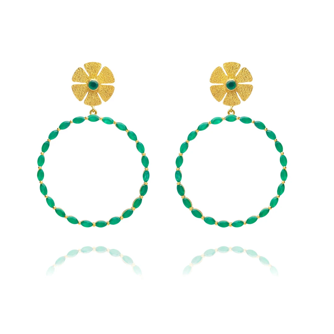 Gold plated hoops with marquise green onyx stone and gold flower post.Â