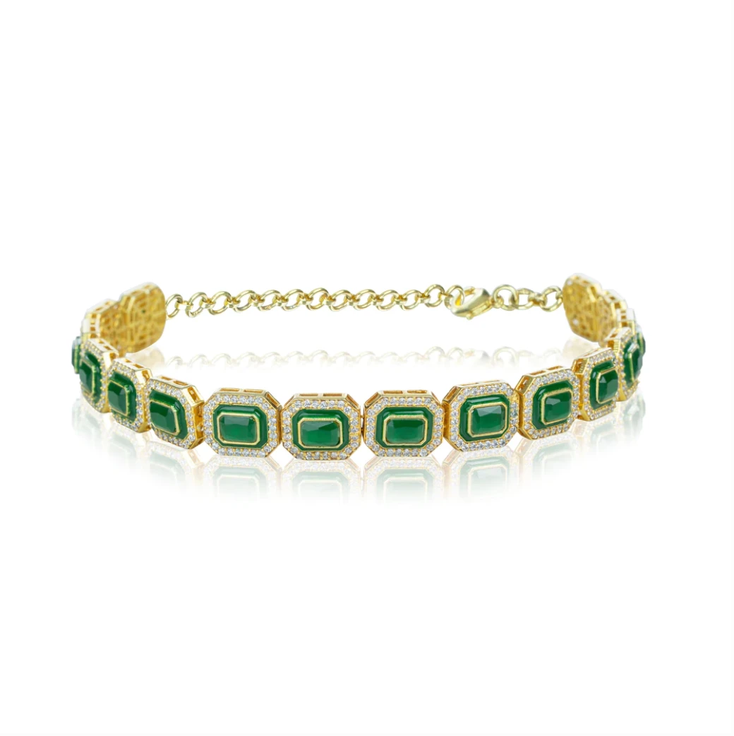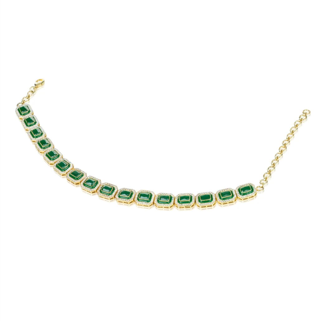 The beautifully hand painted green enamel creates depth and enhances the glistening of the cubic Zirconia embellishment. This timeless piece can be worn both as a choker and a collar.