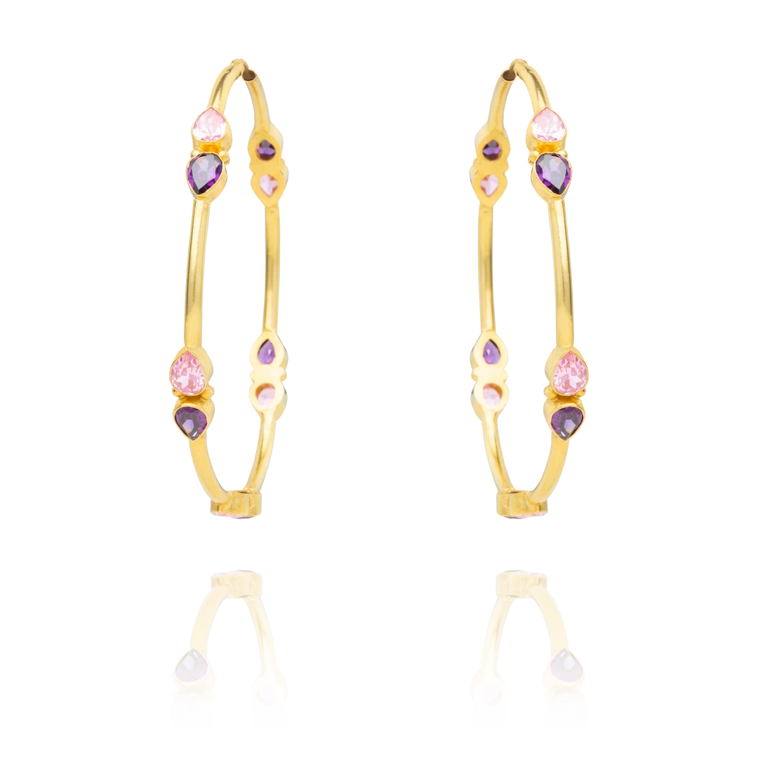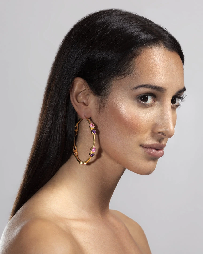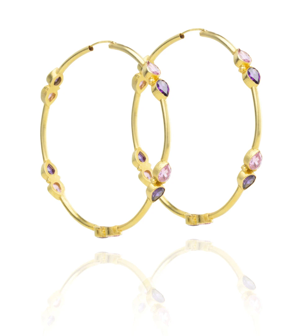 Gold plated statement hoop earrings with pear shaped Amethyst and Rose Quartz CZ.Â
