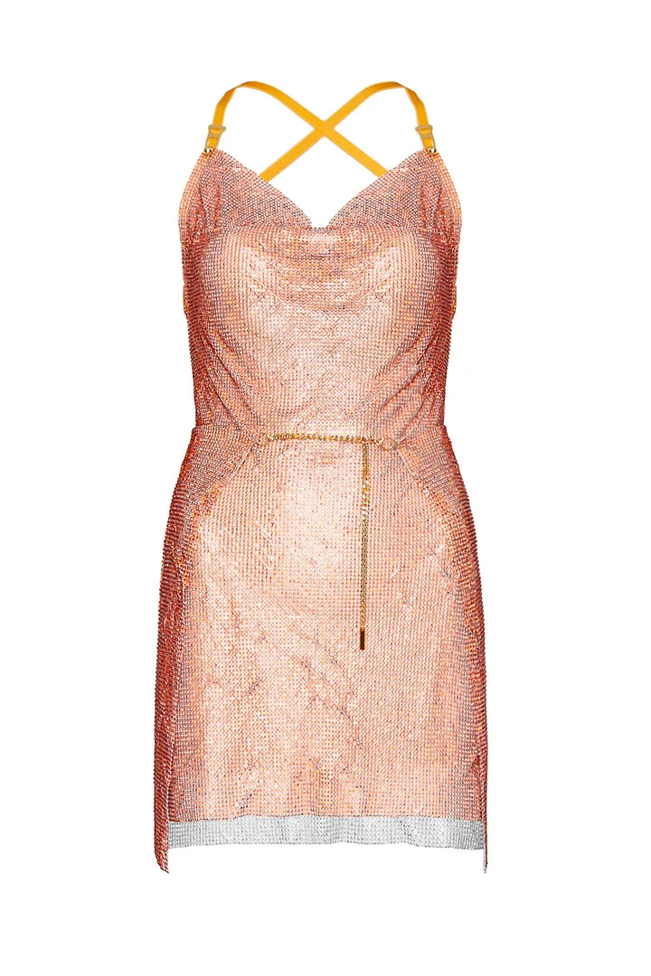The Adrianne Dress in Aperol Spritz from Poster Girl featuring a double wrap skirt panel revealing splits on both thighs. Crystal Embelishment featured throughout the dress and design