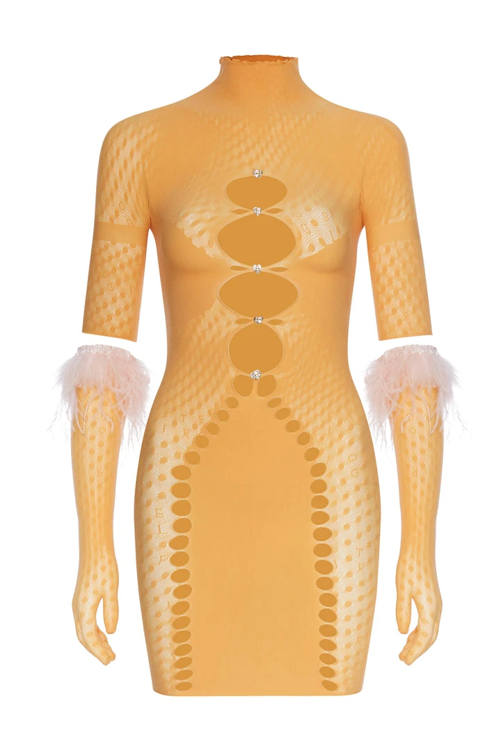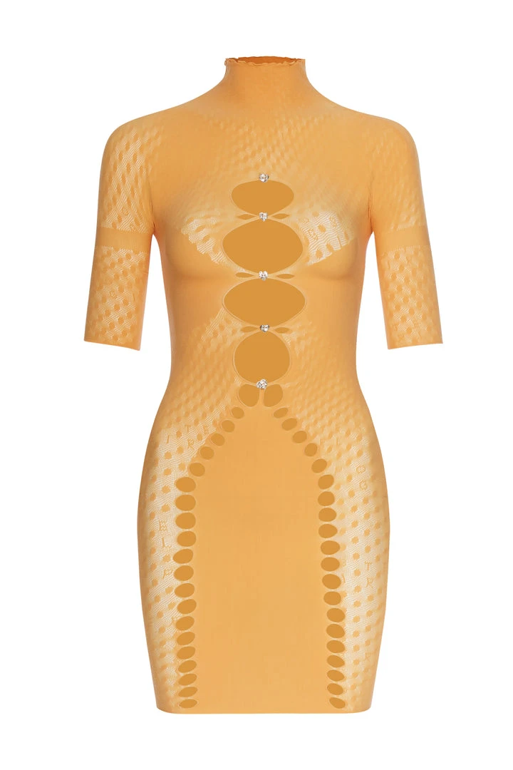 The Pandora Dress is brand new for AW21, POSTER GIRL’s innovative new fishnet shapewear features ‘logo polka dot lace’ and suctions you in all the right places. Multiple cutout crystal heart embellished details in the open-work cut out front with a super soft high neck. The brand’s signature logo is stamped into the lower back.Â