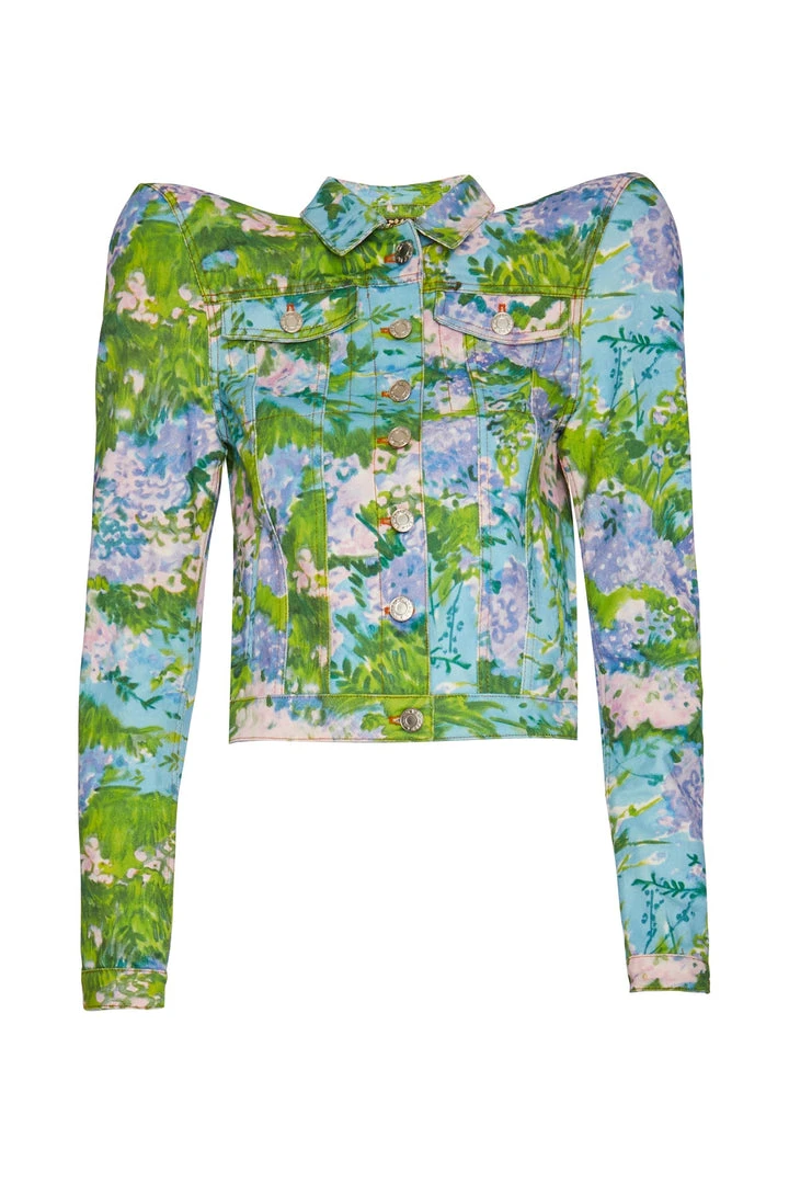 Saturated blue florals decorate Richard Quinn’s boxy denim jacket, inspired by Monet’s painted water lillies.