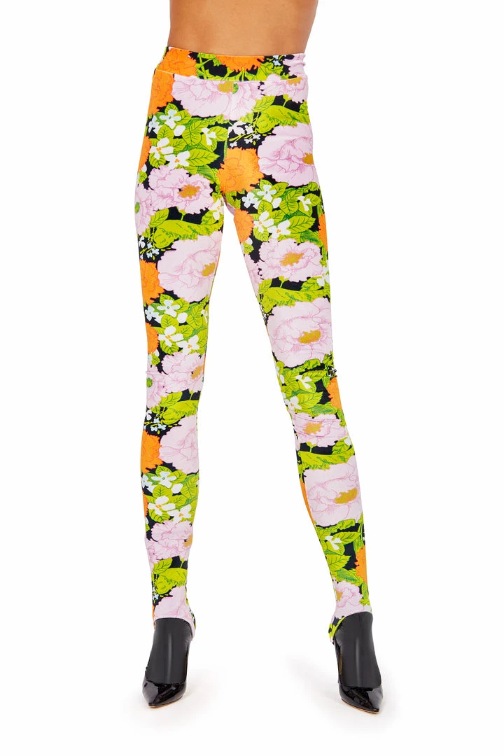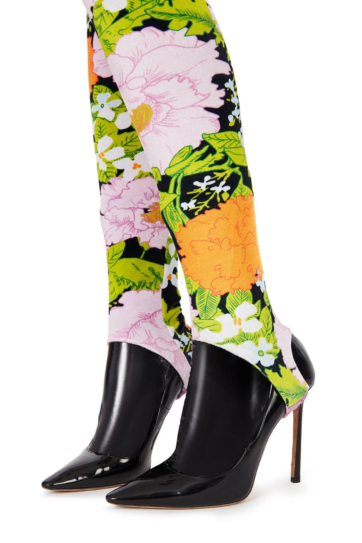 This stretch velour like floral-print orange pastel leggings artfully shaped capturing Richard Quinn’s innovative eye for everyday design.