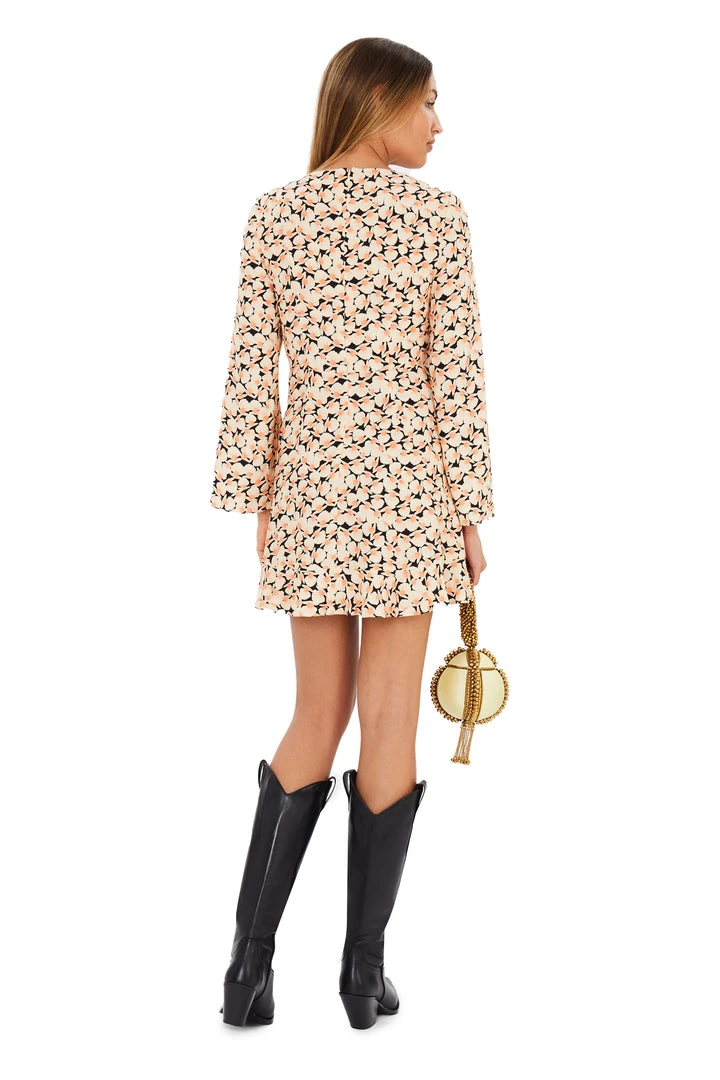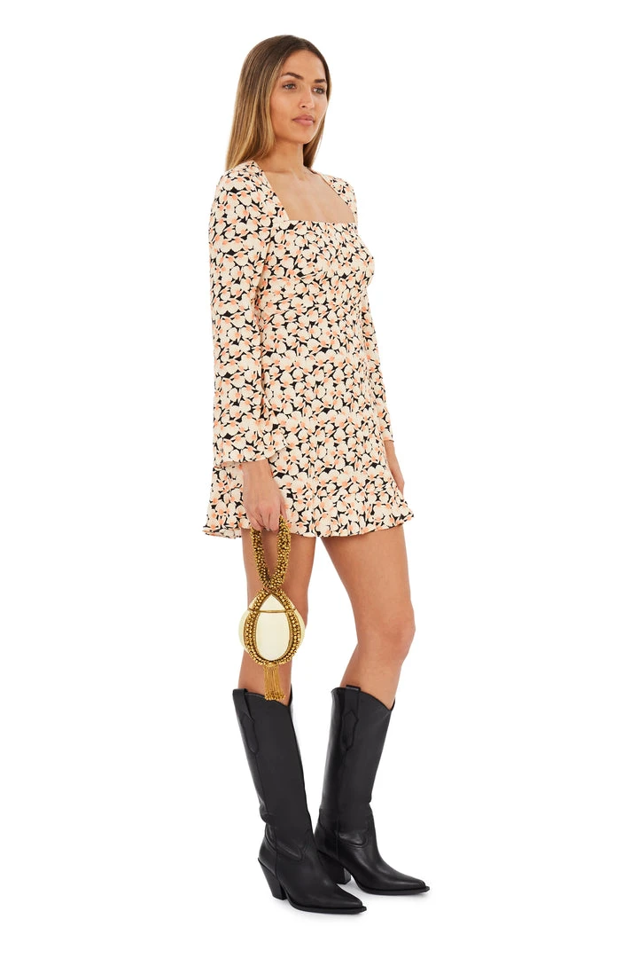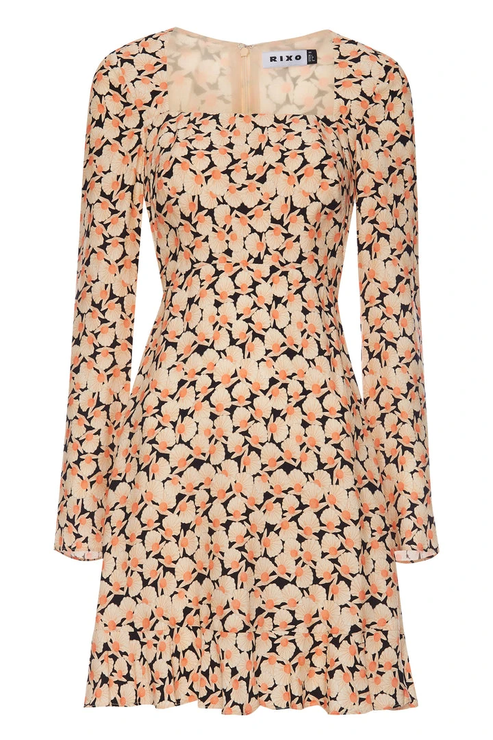 Cut along square neckline, the label’s Mercy mini is a beachside staple in their pearl shell printed crepe. Back zip closure.