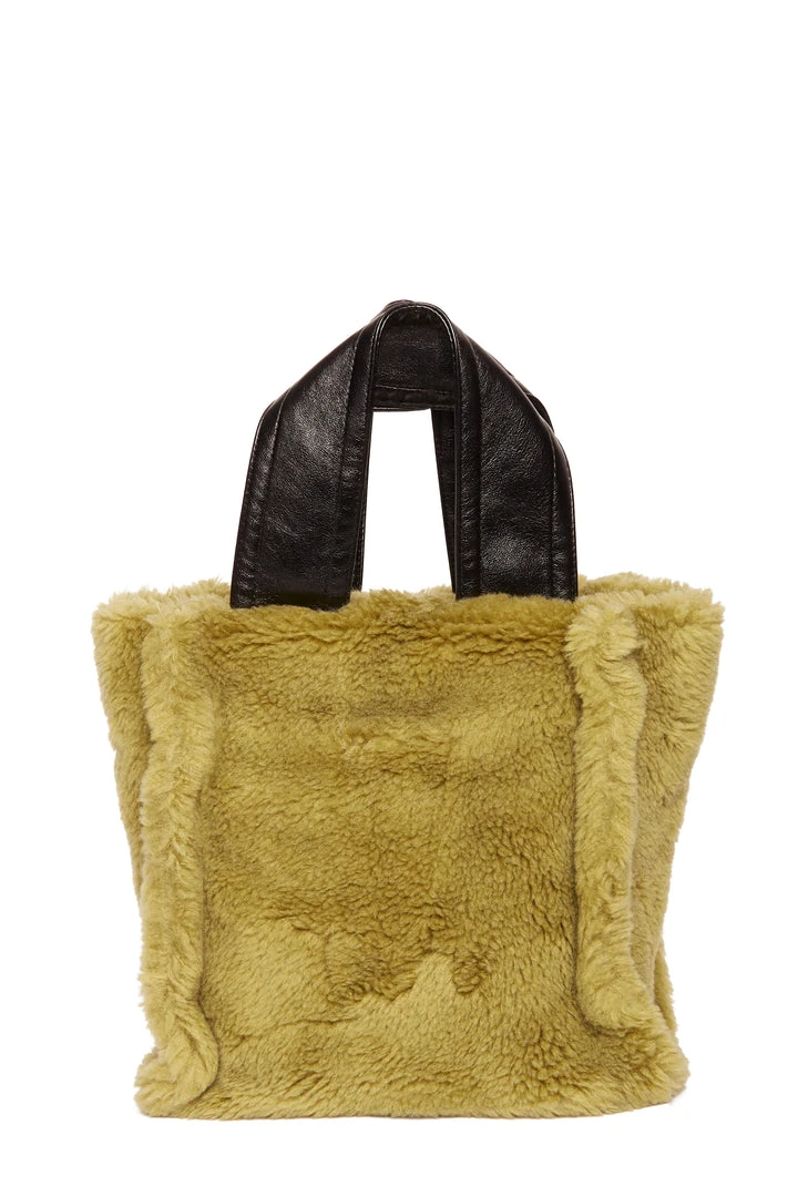 This Army Green STAND STUDIO Lucille small checked faux shearling tote bag boasts an all-over grid pattern. It features a wide black vegan leather top handle, adjustable cross body strap and open top.